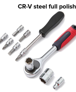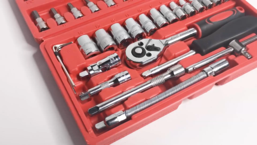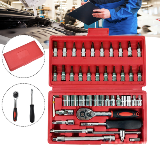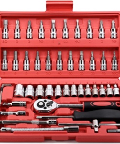A készlet 46 elemből áll, amelyek metrikus és SAE aljzatokat tartalmaznak, valamint egy racsnis meghajtó fogantyút, állítható csavarkulcsot és bitkészletet tartalmaznak.